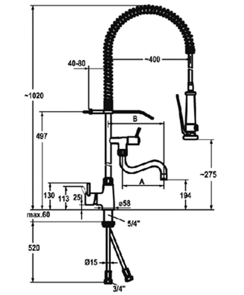 Mitigeur monotrou douchette vaisselle avec temporisation à la fermeture bec orientable avec presse-étoupe resserrable - embout brise-jet ressort de suspension en acier inox Kwc cartouche XL 46 - à grand débit raccords tubulures cuivre ø15 mm - A = 300 B = 370 ( K 24.501.146 ) 115.0315.648