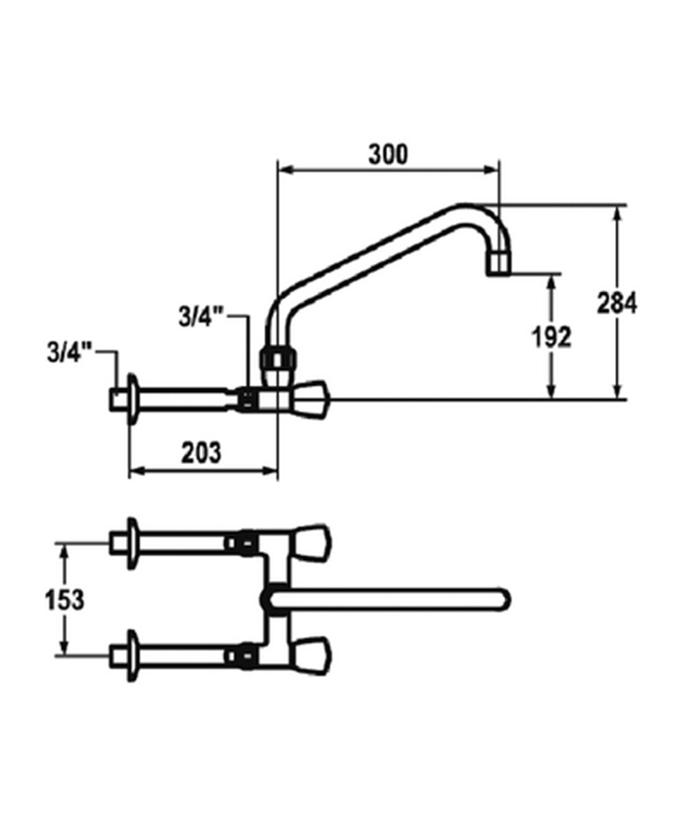 Gastro mélangeur mural croisillons coronachrom en métal. détach. sièges en acier inox clapets plats M 20 x 1,25 bec orientable avec presse-étoupe resserrable embout brise-jet raccords sans pointeaux d'arrêt ¾" x ¾" L 160 saillie 300mm 115.0315.676