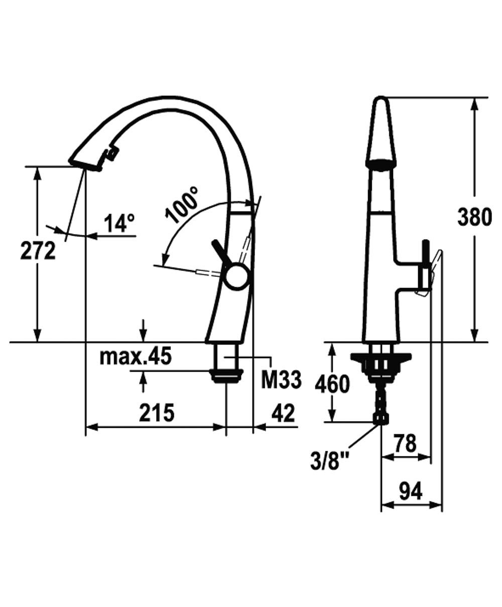 Zoe mitigeur à levier (à droite) avec : col de cygne douchette extractible saillie : 215 mm hauteur : 380 mm 115 0307 911 - 115 0340 019 - 115 0308 235 - 115 0340 020 124349 - 122931 - 123312 - 122926