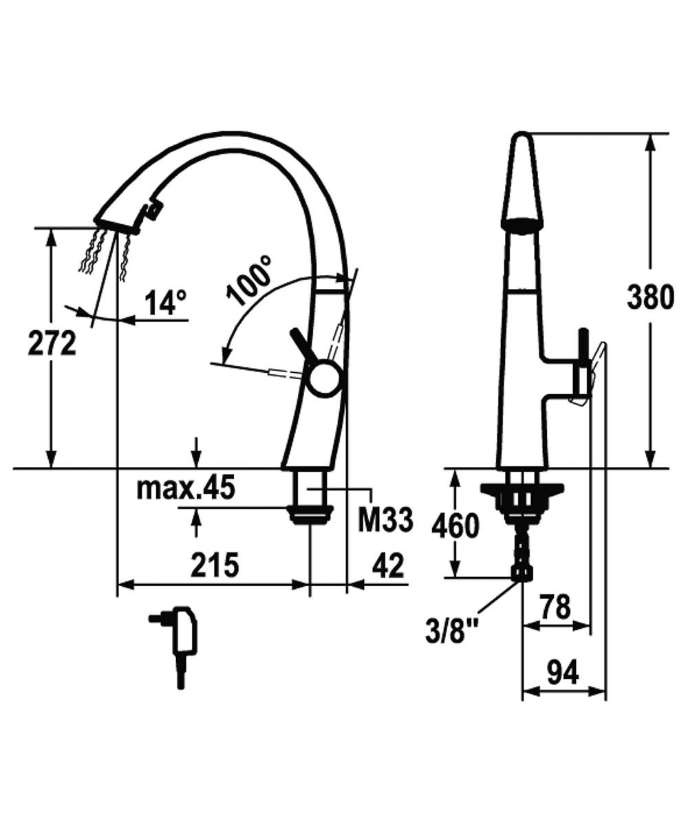 Zoe Mitigeur d'évier LED avec : commande latérale (à droite) douchette extractible système luminaqua saillie : 215 mm hauteur : 380 mm 115 0307 913 - 115 0340 013 - 115 0308 233 - 115 0340 014 123307 - 122921 - 122916 - 124353