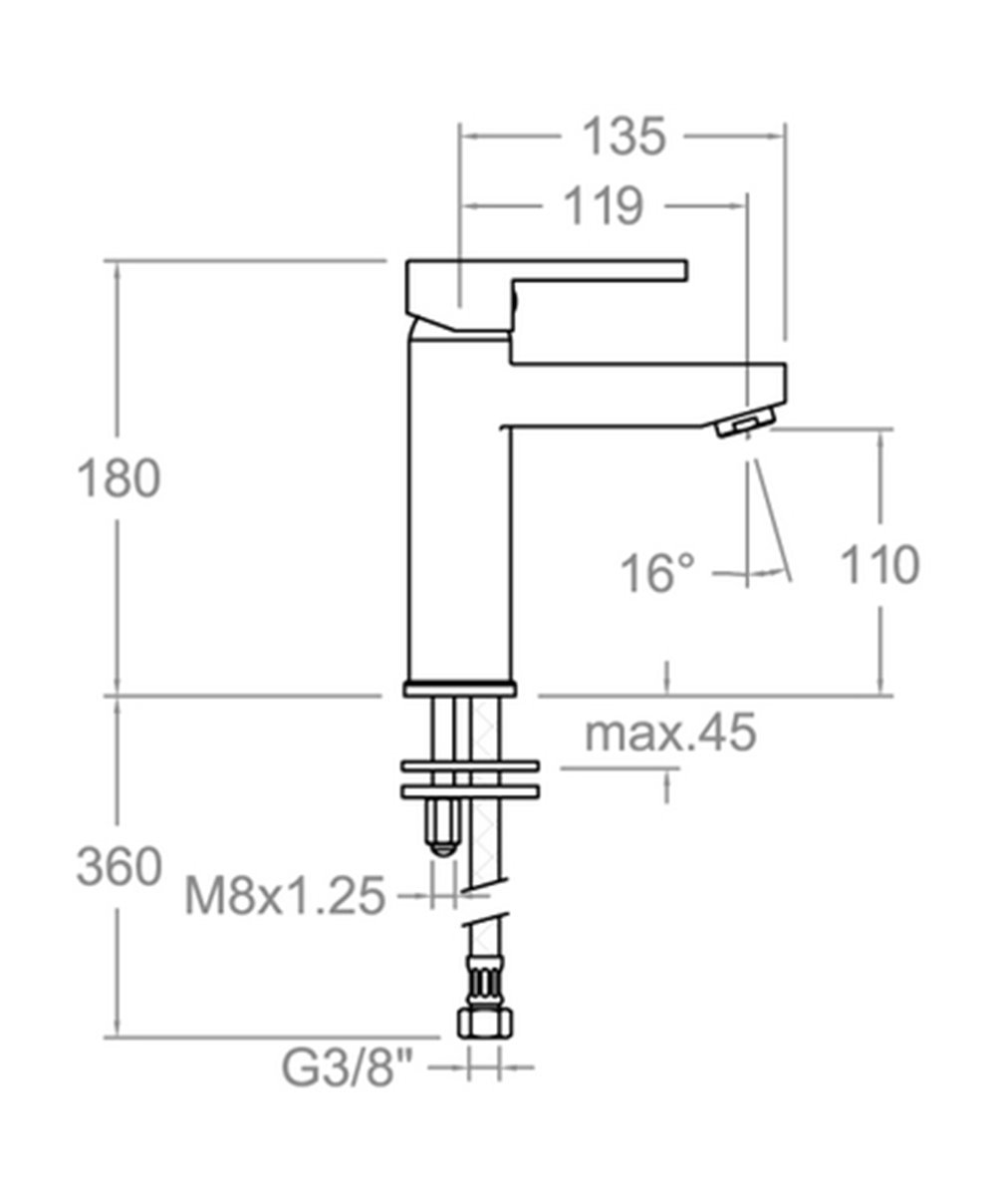 Mitigeur réhaussé de lavabo saillie 141 mm, hauteur 316 mm sans vidage