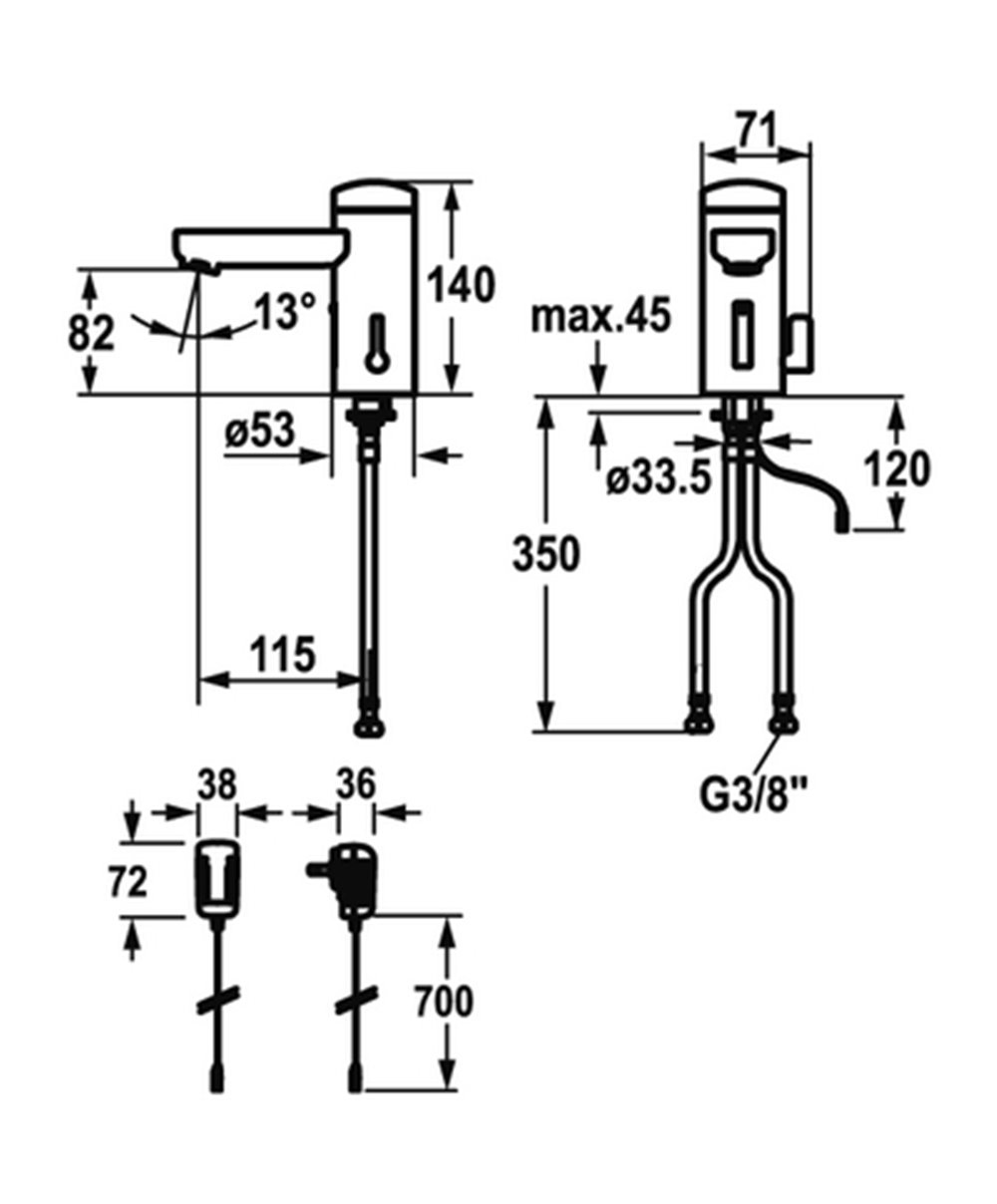 Lavabo sensitive avec mélangeur pour eau froide Fonctionnement automatique bec fixe vanne magnétique raccordement flexible ⅜" sur batterie ou sur secteur 615.0636.495 - 615.0636.496