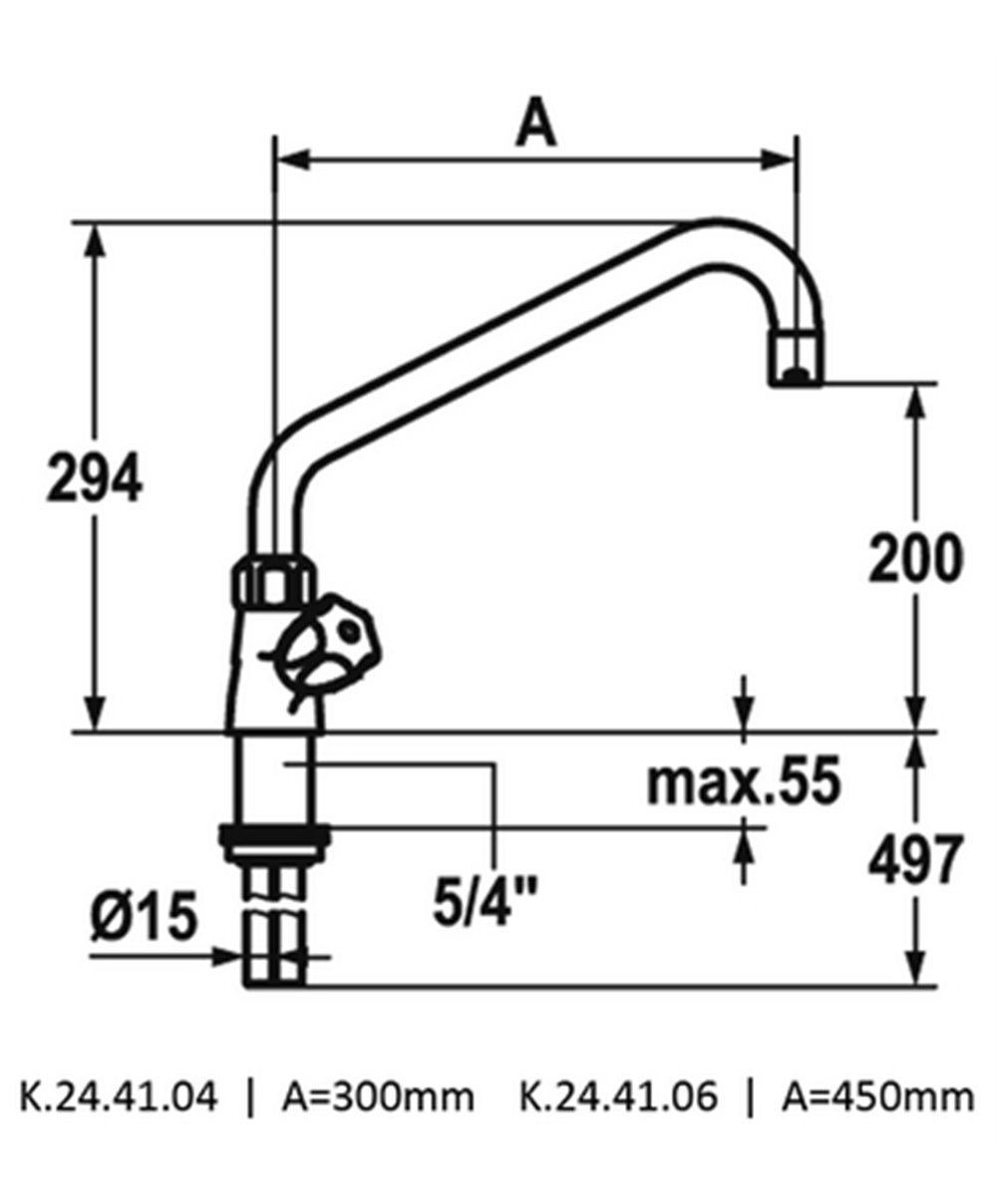 Mélangeur monotrou croisillons coronachrom en métal. détach. sièges en acier inox clapets plats M20x1,25 bec orientable 360° avec presse-étoupe resserrable embout brise-jet ¾" Débit à 3 bar - brise-jet 80 l/min A = 300 mm (K 24.41.04) 115.0315.624