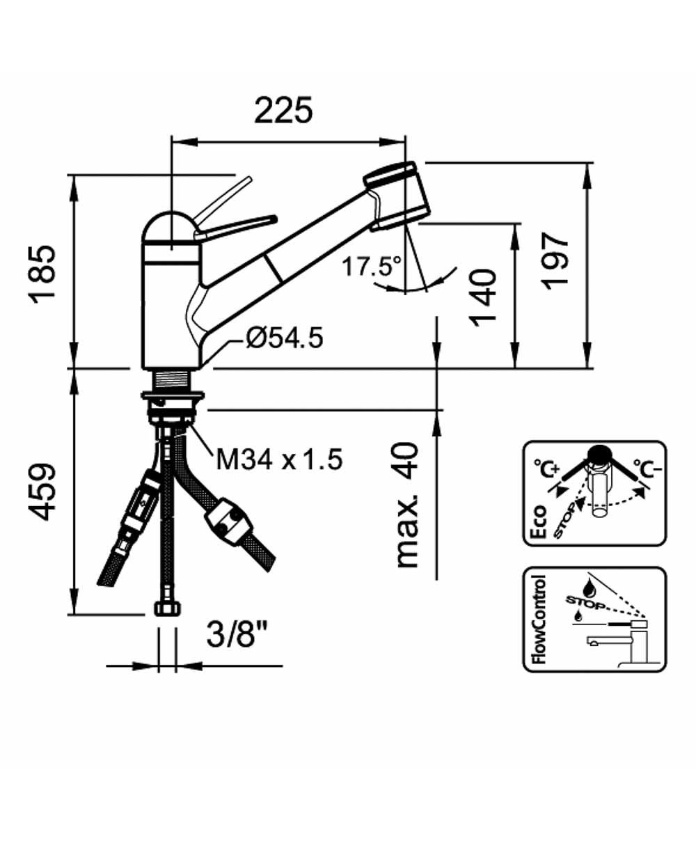 Mitigeur d'évier déboitable avec : bec extractible bec mobile : 180° hauteur : 314 mm - saillie : 220 mm raccordement par flexibles