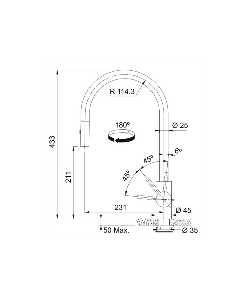 Mitigeur d'évier avec : poignée mousseur sur flexible bec mobile : 180° hauteur : 433 mm - saillie : 231 mm raccordement par flexibles