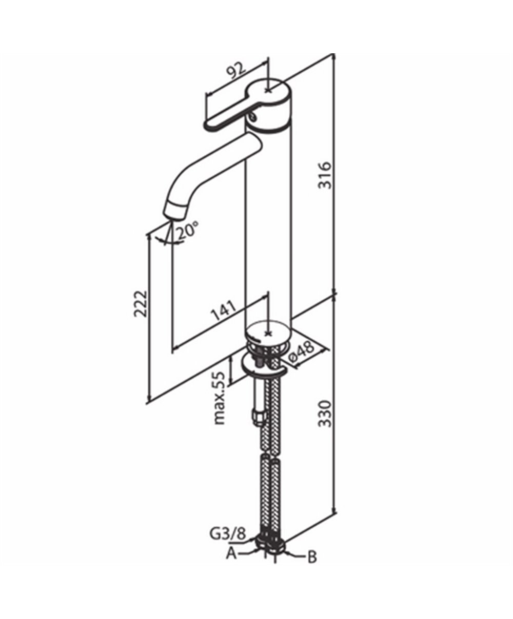 Mitigeur réhaussé de lavabo saillie 141 mm, hauteur 316 mm sans vidage