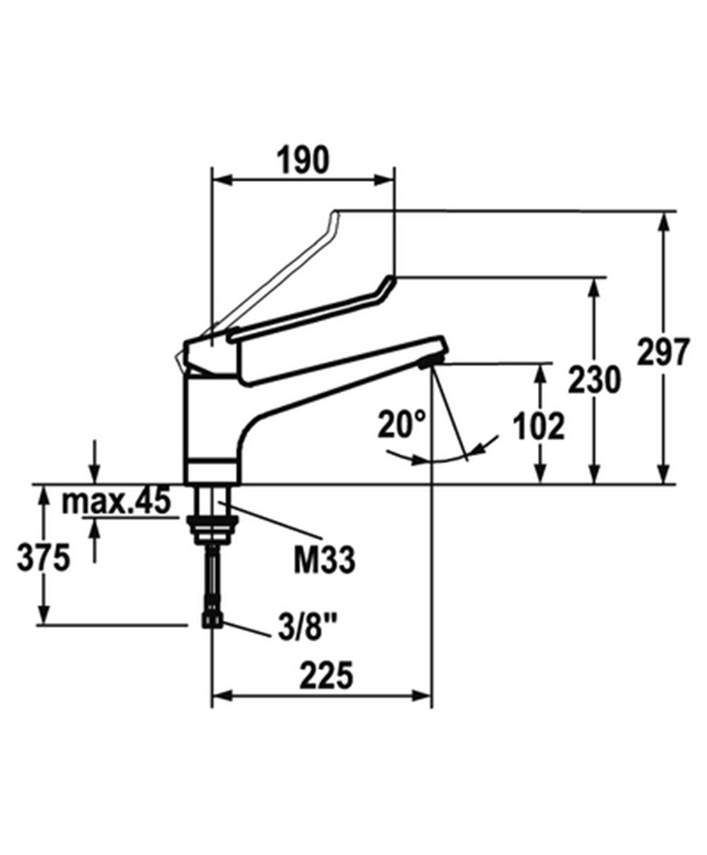 Mitigeur à levier ouvert bec orientable 150° saillie : 225 mm cartouche M 35 S raccordement flexible 3/8" 115.0635.388