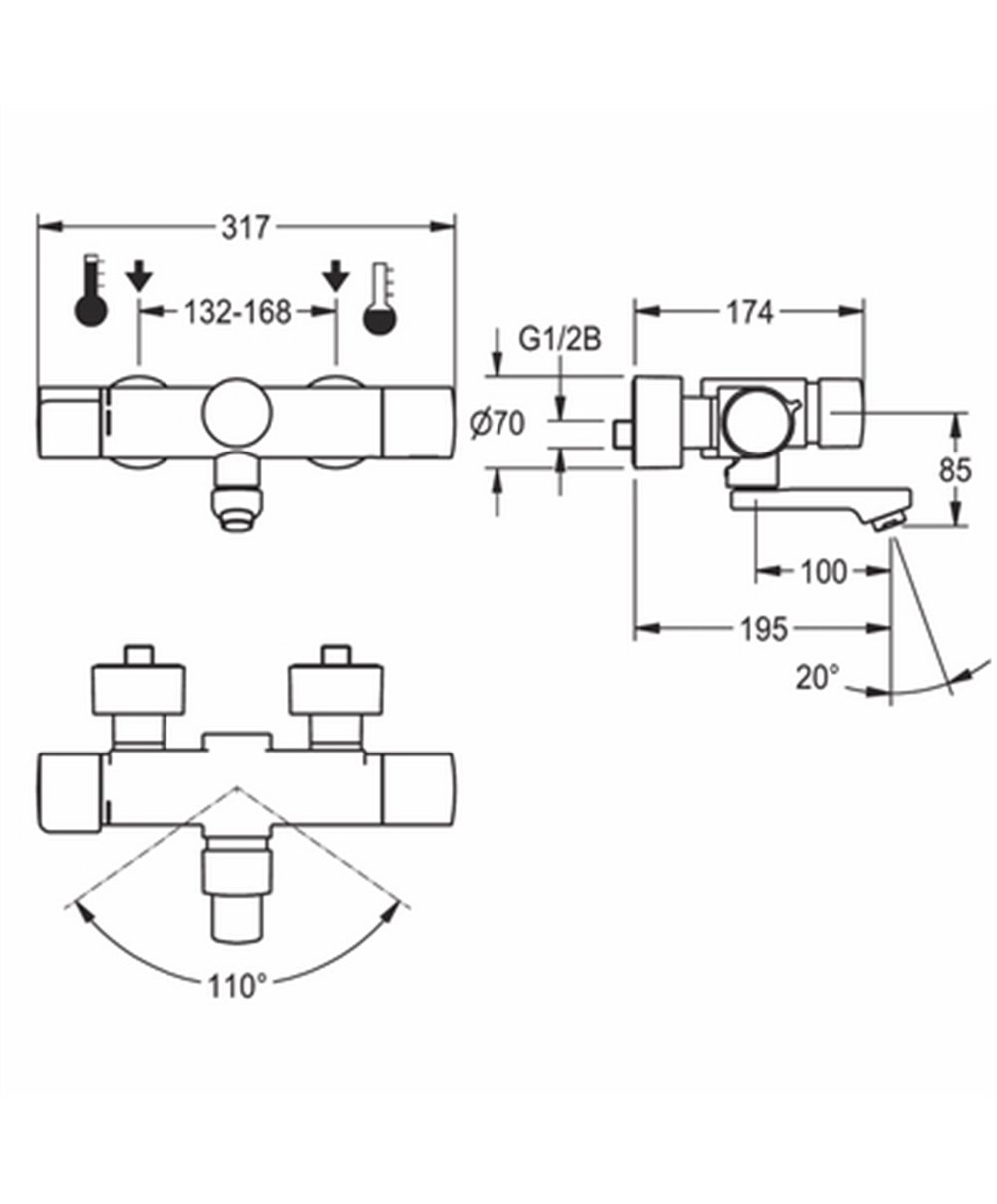 Mitigeur thermostatique mural à fermeture automatique bec mobile 135, 195 ou 255 mm temporisation réglable unité de nettoyage pré-assemblée incluant un capteur avec commande électronique et pile au lithium de 6 V protection contre l’ébouillantage rinçage hygiénique ctivé avec intervalles fixes de 24 heures raccordement sur les arrivées d’eau chaude et d’eau froide