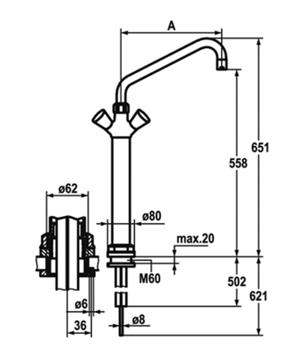 Mélangeur monotrou sur colonne 300 mm croisillons coronachrom en métal. détach. sièges en acier inox clapets plats M 20 x 1,25 bec orientable 360° avec presse-étoupe resserrable et embout brise-jet socle prémonté vidage automatique du bec A = 300 mm (K 24.41.32)
