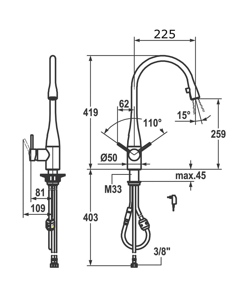 Mitigeur d'évier LED avec : commande latérale douchette extractible système luminaqua saillie : 225 mm modèle haut : 419 mm mécanisme Z 534 836 115 0308 180 - 115 0308 203 - 115 0308 204 - 115 0308 182 Hauteur libre : 18 cm 121325 - 121240 - 122169 - 1221