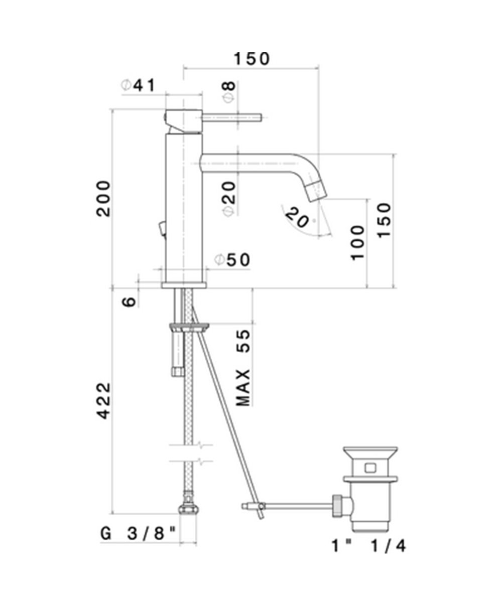 Mitigeur de lavabo - bec 150 mm avec vidage automatique Réf. mécanisme 14720 raccordement flexibles 3/8"