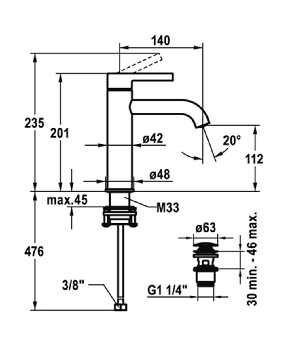 Mitigeur de lavabo bec fixe 140 mm avec ou sans vidage raccordement par flexibles cartouche M 35 OP 615.0583.498 615.0618.851 - 615.0618.852 615.0618.906 - 615.0618.907