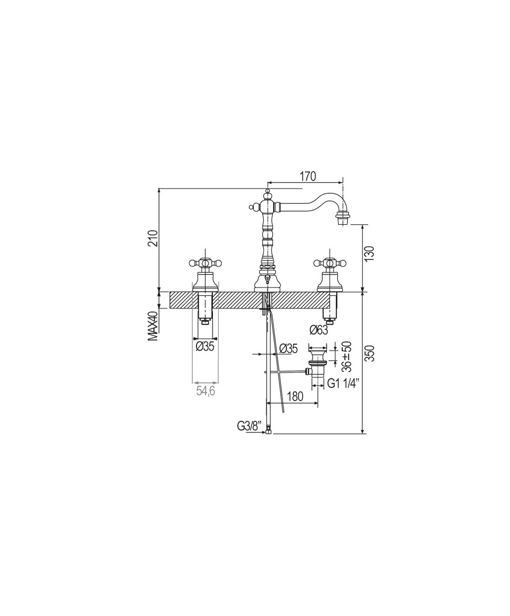 Mélangeur 3 trous de lavabo bec arrondi hauteur 322 mm sailie 180 mm sans vidage
