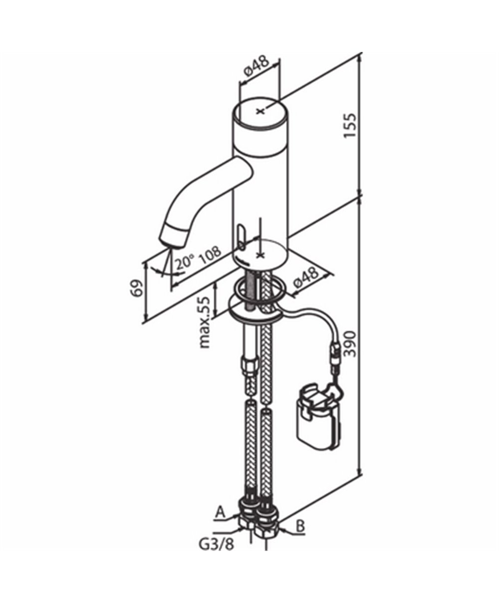 Lavabo sensitive sans mélangeur pour eau froide Fonctionnement automatique bec fixe vanne magnétique raccordement flexible ⅜" sur batterie ou sur...